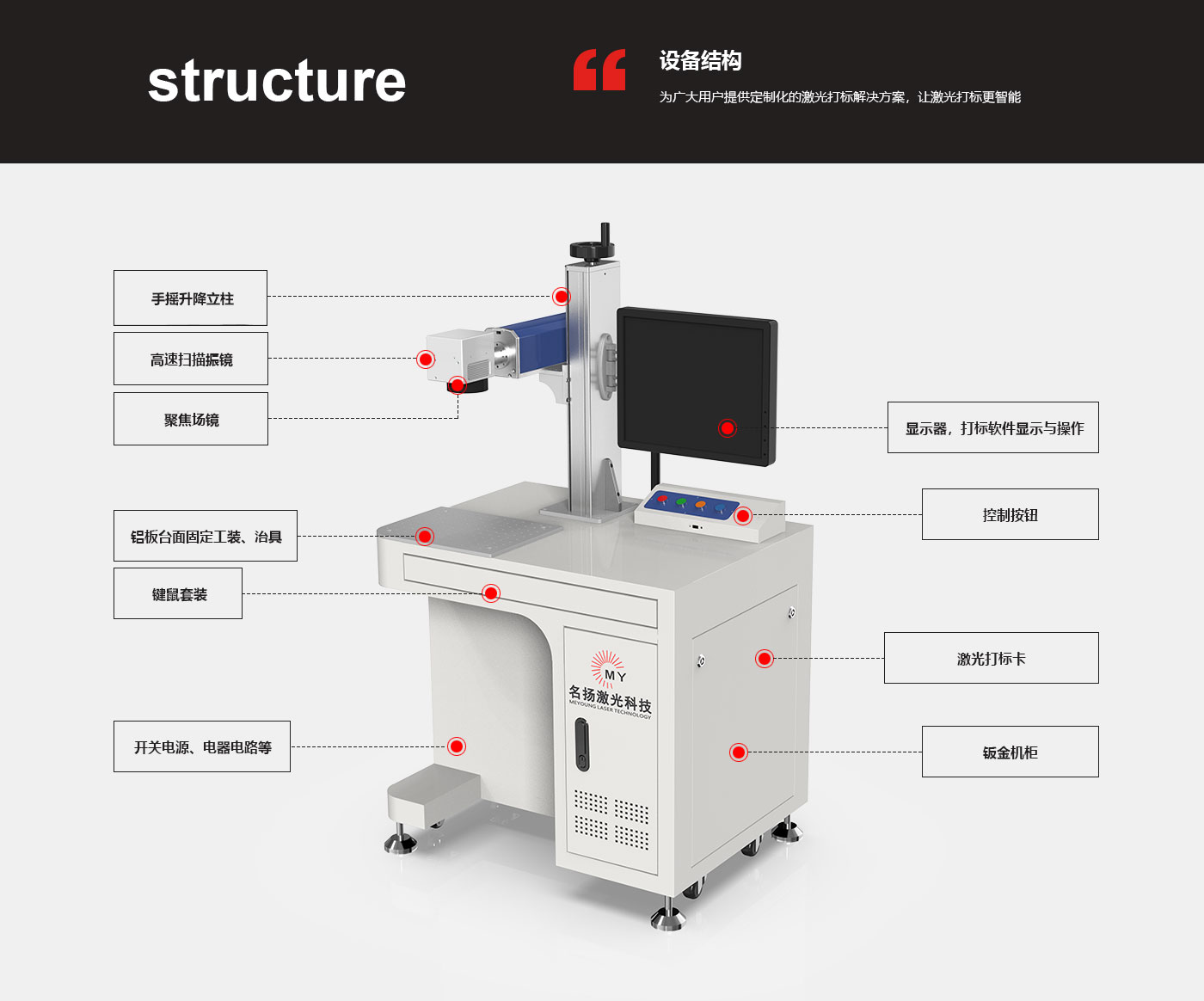 ? 可選配MOPA激光器實現(xiàn)陽極氧化鋁打黑,選配視覺定位系統(tǒng)實現(xiàn)視覺定位打標(biāo)